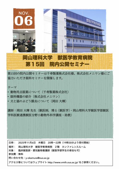 2025年11月6日に第15回岡山理科大学獣医学教育病院公開セミナーが開催されます。